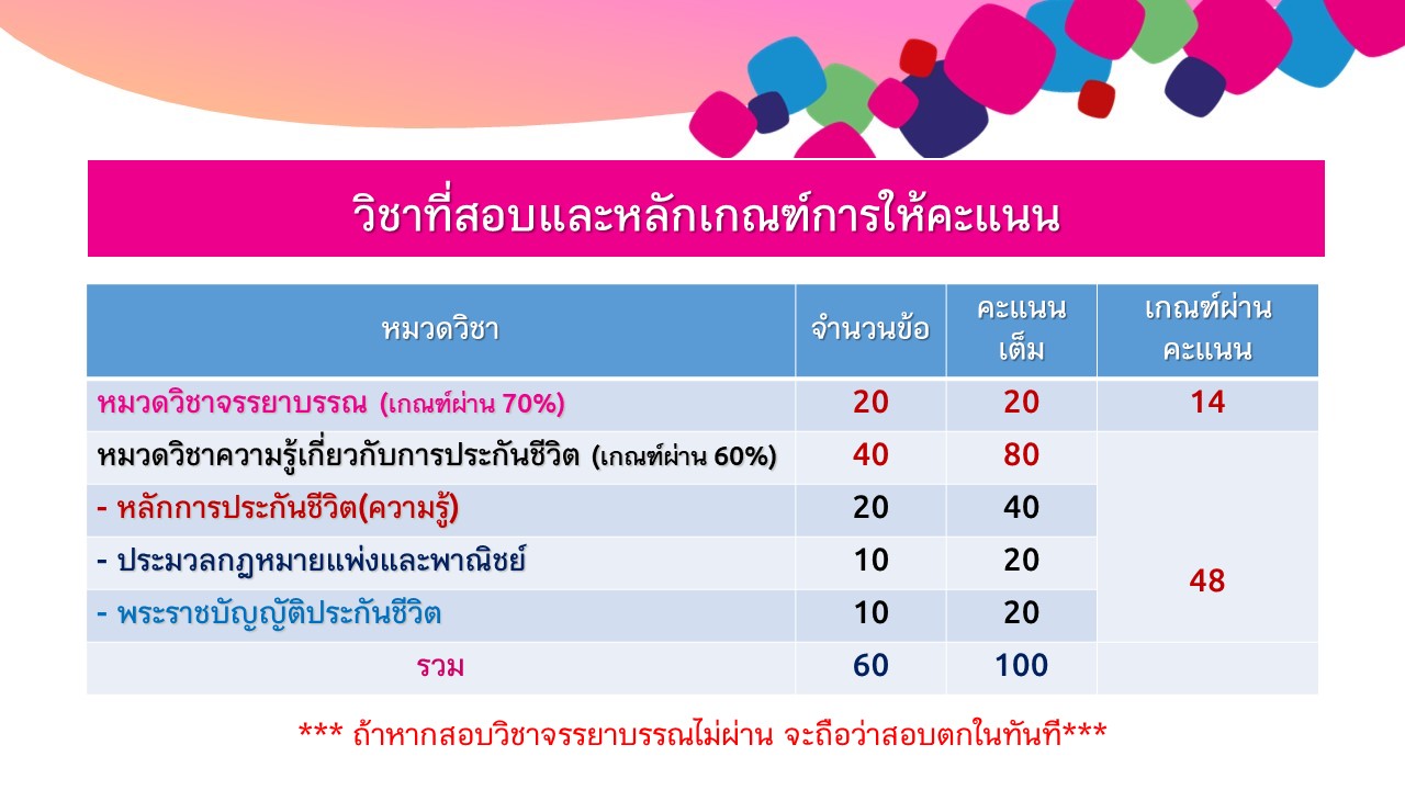 วิชาที่สอบตัวแทนประกันชีวิตและหลักเกณฑ์การให้คะแนน